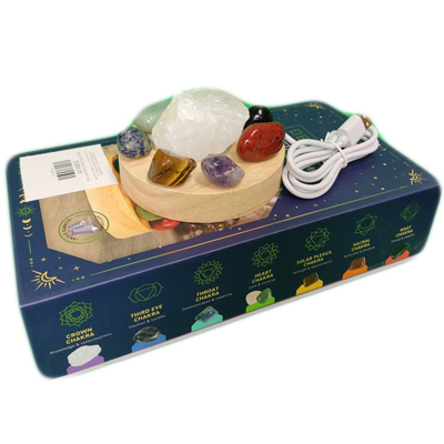 - Új állapotú return termék, saját dobozában. A készlet a következő ásványokat tartalmazz: Tiszta kvarc, amethyst, lapis lazuli, rózsakvarc, zöld aventurin, tigris szem, vörös jáspis, fekete obszidián. A készlethez jár egy kis, asztali lámpa, usb kábellel.