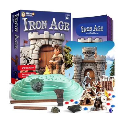 - 1 ásótömb, kalapács, véső, ásótálca, 2 jelenetkártya, idővonal poszter és útmutató. Nincs szükség extra eszközökre.
